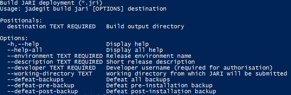 The jari subcommand provides the ability to build a Jade Authorised Release Instruction (JARI), for deployment via JSM (JadeCare Systems Manager) to managed environments.