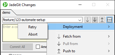 Following a deployment failure (which may be due to external factors like disk space, or due to an unsupported scenario), the deployment can be retried or aborted via the JadeGit Changes repository menu.